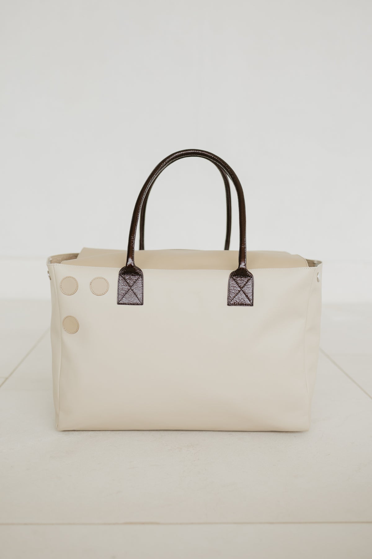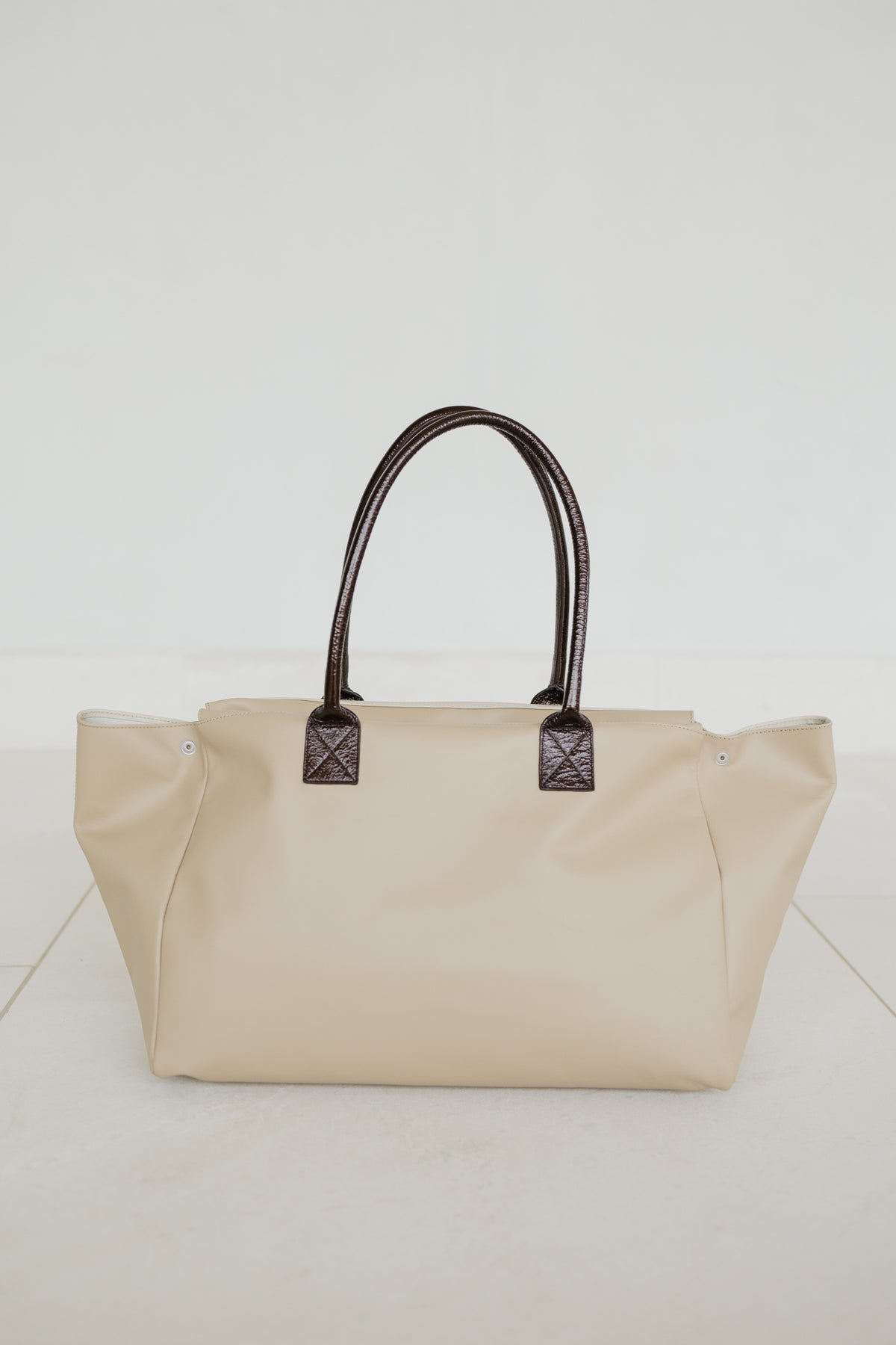 This is an ideal, spacious shopping bag. You can easily shape the bag with two snap buttons.